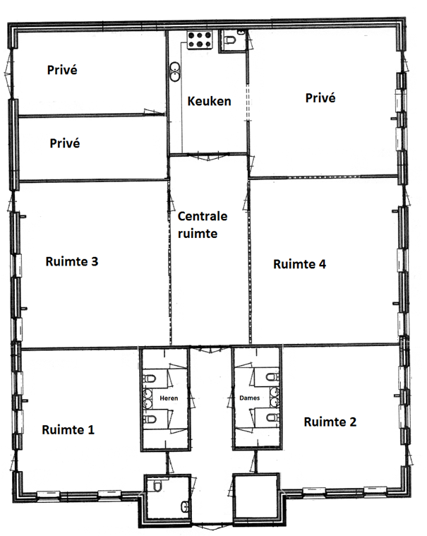 Ruimten 1 t/m 4, de centrale ruimte, het sanitair en de keuken kunnen worden gehuurd en gebruikt. Ook is het mogelijk om ruimte 3, 4 en centrale ruimte om te bouwen tot één grote ruimte dankzij de deelbare tussenwanden. Ruimte 1, 2, 3 en 4 hebben een aparte deur naar buiten.
